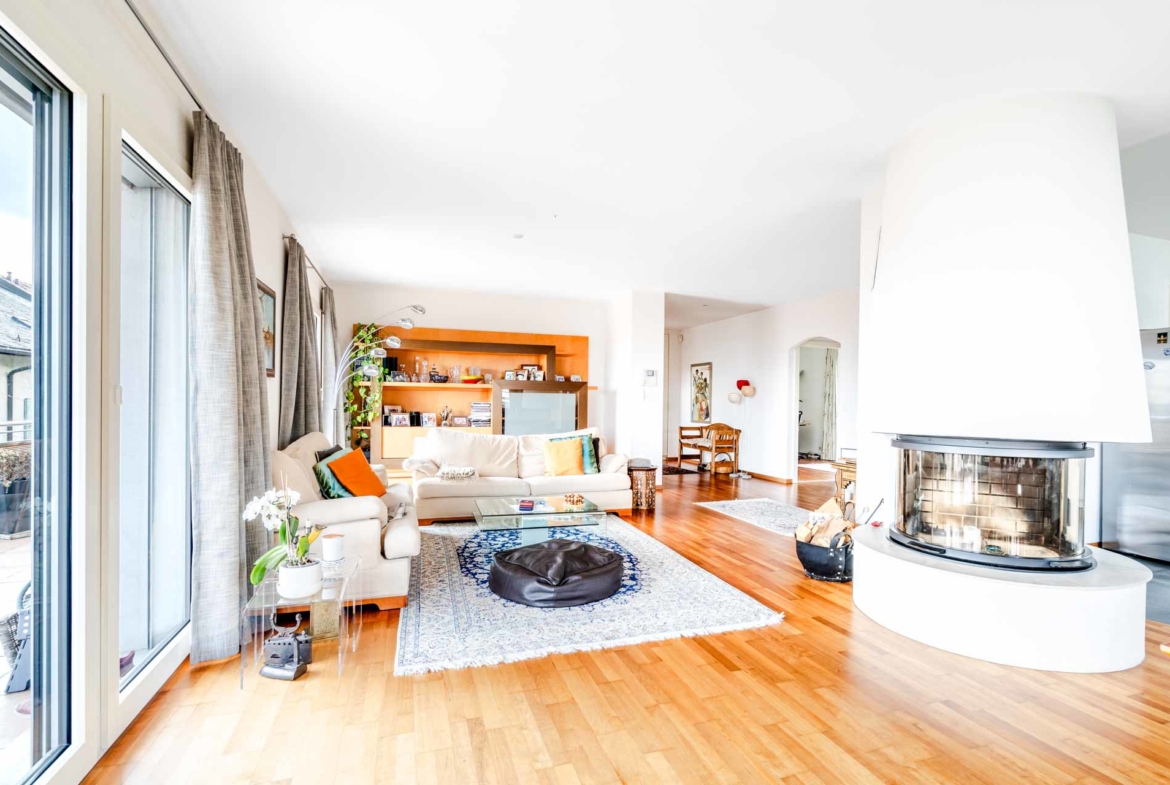 Avec une surface généreuse d’environ 227m² habitables, ce duplex propose de vastes espaces baignés de lumière naturelle. Le séjour, spacieux et convivial, s’ouvre sur un balcon de 20 m² exposé plein sud, offrant une vue dégagée sur le lac Léman et les montagnes.