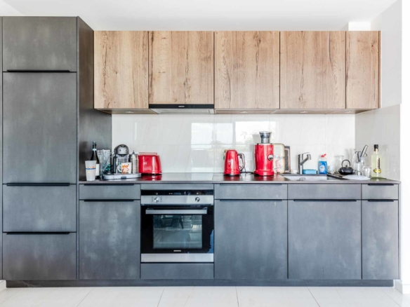 Cet appartement de 2,5 pièces s’ouvre sur un hall d’entrée avec des rangements pratiques. Celui-ci dessert ensuite le grand séjour et sa cuisine entièrement équipée.