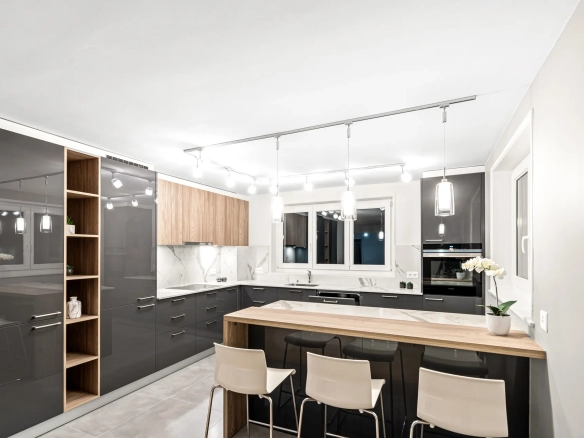 La cuisine moderne et ouverte, entièrement équipée, s’intègre harmonieusement à l’espace de vie, créant un cadre convivial, idéal pour recevoir.