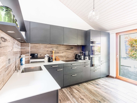 La cuisine/salle à manger au 3ème étage s’ouvre sur une terrasse, offrant un espace extérieur idéal pour se détendre et profiter des repas en plein air. La suite parentale bénéficie également d’une vue sur le lac.