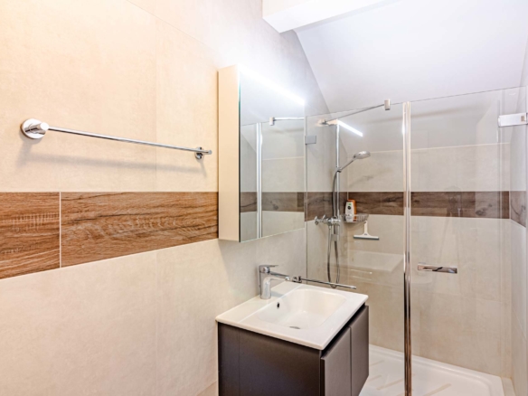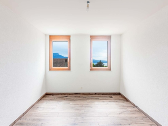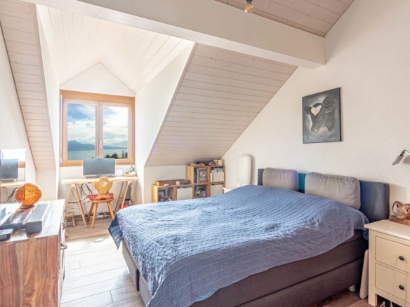 Dotée d’un ascenseur semi-privatif desservant les trois étages ainsi que le parking, elle comprend trois chambres (possibilité d’en créer une quatrième), deux salles de bain ainsi qu’un WC visiteur et un séjour lumineux avec une loggia offrant une vue imprenable sur le lac et les montagnes.
