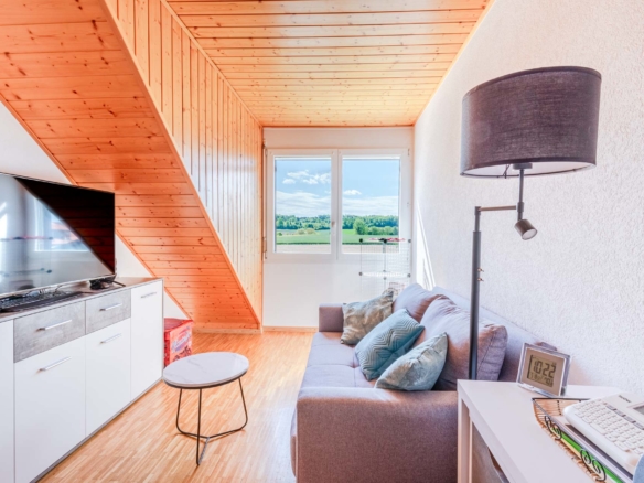 Au Rez-de-chaussée, vous trouverez un hall d’entrée, une salle de douche / WC, une cuisine ouverte, entièrement équipée, un très grand séjour avec poêle suédois et un accès au balcon avec vue dégagée.