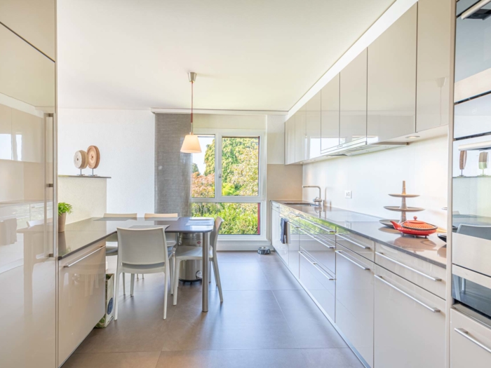 L’appartement propose aussi deux places de parking intérieures et trois places de parking extérieures (en sus.) ainsi qu’une grande cave et une buanderie privative.