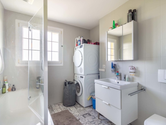 Dans la partie jour, vous découvrirez une vaste et lumineuse pièce de vie comprenant un séjour avec poêle et un espace salle à manger convivial, ouvert sur une jolie cuisine. Grâce à de grandes baies vitrées, vous aurez accès directement à un joli balcon d’environ 12 m², idéal pour profiter des journées ensoleillées. Une salle de bains avec colonne de lavage ainsi qu’une salle d’eau complètent agréablement cet espace.