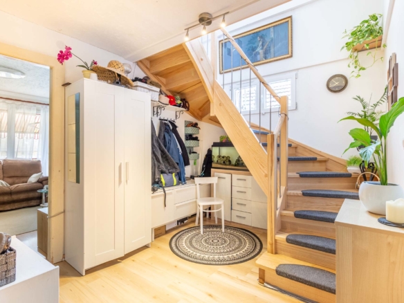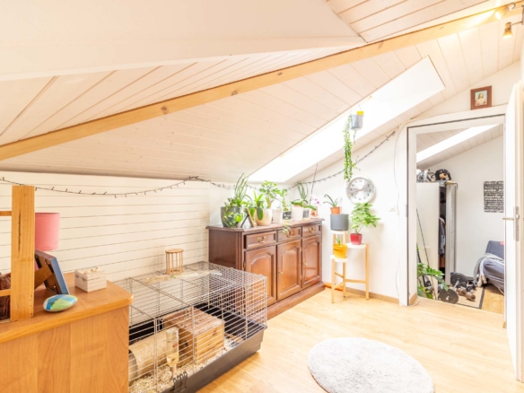La disposition en duplex confère une dimension supplémentaire à cette résidence, permettant une séparation harmonieuse des espaces.