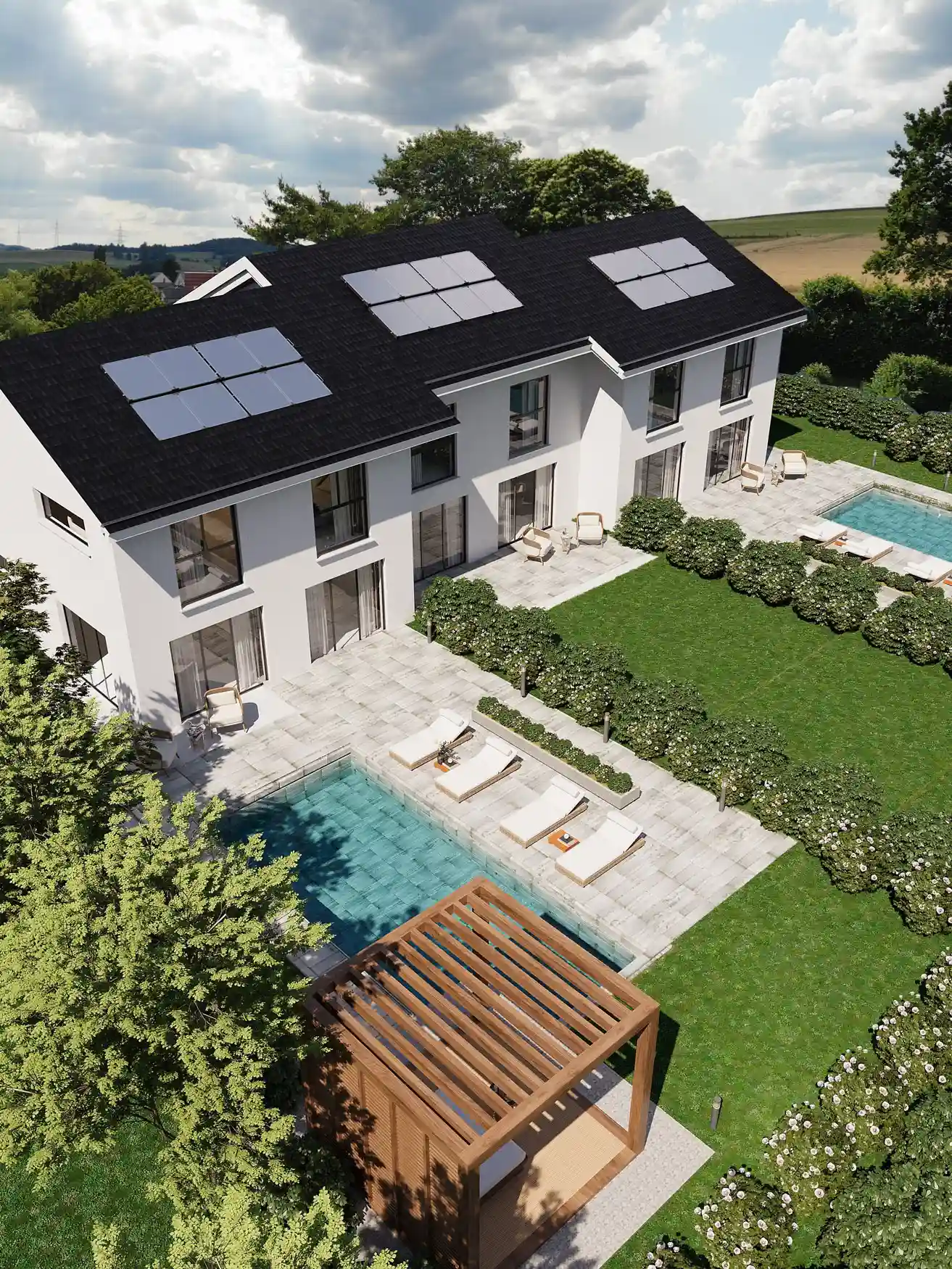 Doté d’un chauffage au sol alimenté par une pompe à chaleur efficace, de panneaux solaires photovoltaïques pour une énergie verte et d’un triple vitrage pour une isolation optimale, ce système garantit confort et durabilité tout en réduisant les coûts énergétiques.